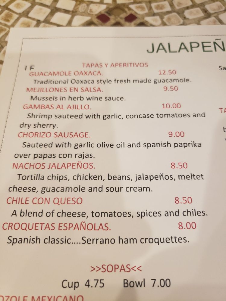 Welcome to Jalapenos Annapolis, a delightful Mexican gem located at 85 Forest Dr in Annapolis, MD. This restaurant is celebrated for its vibrant tapas and authentic flavors that transport diners straight to Mexico. The menu offers an array of enticing options, from the freshly prepared Guacamole Oaxaca to hearty Mejillones en Salsa mussels, both perfect for sharing. For lunch, indulge in their Gazpacho Sopas or Sopa de Frijoles Negros, which have garnered rave reviews for their amazing flavor profiles.